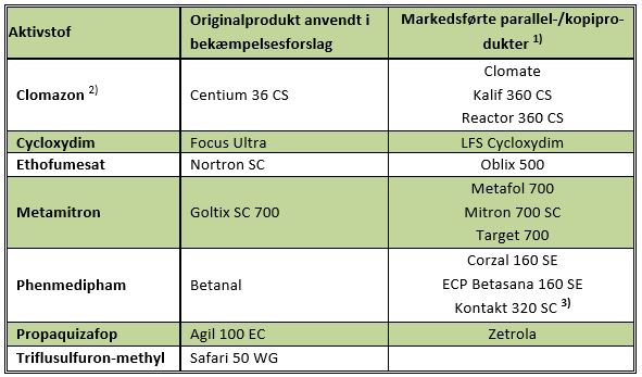 Tabel 3 Godkendte ukrudtsmidler i roer og markedsførte parallel-/kopiprodukter