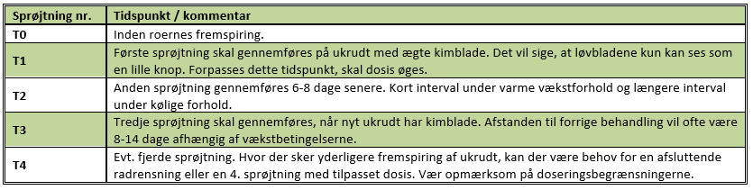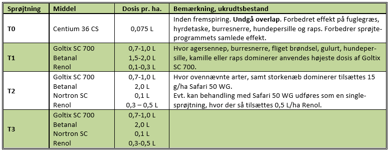 Ukrudtsbekæmpelsen tager udgangspunkt i sprøjteforslagene i tabel 8. Hvor der kun forekommer en "almindelig" ukrudtsbestand uden svært-bekæmpelige arter, kan du få et tilfredsstillende resultat ved at følge nedenstående, men ofte vil der være hårdføre ukrudtsarter, der kræver højere dosis, eller måske driller vejret, så timingen ikke bliver perfekt. I disse tilfælde må tankblanding og timing af sprøjtningerne justeres. Ved sådanne udfordringer må du rådføre dig med din planterådgiver. For sprøjtetidspunkt henvises til tabel 1.