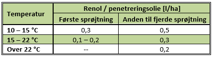 Tabel 9 Retningslinjer for dosering af penetreringsolie afhængig af