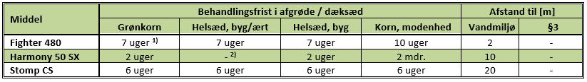 Til ukrudtsbekæmpelse i kornafgrøderne anvendes en blanding af ældre og nyere produkter. Der er ikke kommet nye midler til denne sæson; dog kan der være enkelte nye kopiprodukter/handelsnavne. Nogle midler kan anvendes i alle kornarter, men nogle få er ikke godkendt i havre. I tabel 1 nedenfor ses en oversigt over de mest gængse midlers godkendelse.