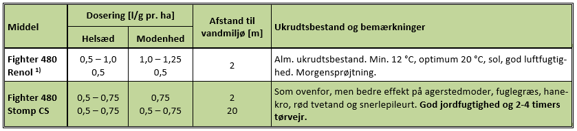 Det eneste middel, der er fuldt skånsomt over for kløveren, er Fighter 480, som kan anvendes uden hensyn til kløverens størrelse. Den bedste effekt opnås på små ukrudtsplanter under gode temperaturforhold. Tankblanding med Stomp CS kan give en effektforbedring på arter som fuglegræs, agerstedmoder og snerlepileurt, når der er god jordfugtighed, men pris/effekt-forholdet samt generelt ugunstige betingelser for jordmidler i foråret gør bred anvendelse uaktuel – i særdeleshed under tørre forhold. Hvis du vælger at bruge Stomp CS, skal frøene være dækket af jord for at undgå, at sprøjtningen påvirker udlægget. Se standardløsninger i tabel 11