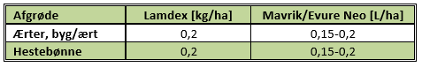 I rene ærter, byg/ært og hestebønner kan bladrandbillerne bekæmpes med pyrethroider. I øjeblikket er kun Lamdex og Mavrik/Evure Neo godkendt. Se forslag til dosis i tabellen herunder.