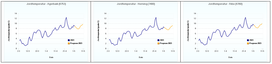 Figur 1 Jordtemperatur. Aktuel temperatur den 2. maj, og femdøgnsprognose for Agerbæk, Herning og Ribe (Kilde: SEGES)