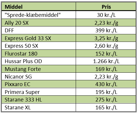 Med udgangspunkt i de godkendte midler, kan der kombineres rigtig mange forskellige løsninger sammen, som alle kan bekæmpe ukrudtet i de fleste marker. Middelvalget er ikke bare et spørgsmål om effekt, men i høj grad også om pris. Imidlertid er sammenligning af priser et uoverskueligt kaos af vejledende (læs "vildledende") priser og detailleddets forskellige rabatordninger. For blot at have en nogenlunde idé om prisniveauet på de viste standard-løsningsforslag har vi anvendt flg. priser, som er hentet i "Middeldatabasen" (opdateret 01.05.2023).