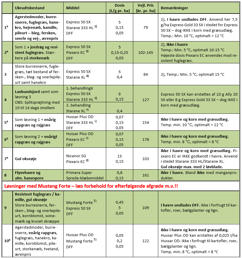 Nedenstående standardløsninger er gældende for kornafgrøder i begyndende buskning fra vækststadium 20, og for ukrudt med 3-4 løvblade. For flere ukrudtsmidler er kun lavere doseringer lovlige før vækststadium 20; dette gælder bl.a for produkterne Pixxaro EC, Starane XL og Starane 333 HL, som anvendes i flere af løsningsforslagene.