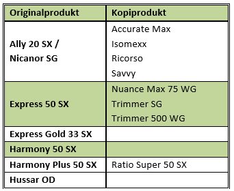 5 g Express 50 SX svarer til 3,33 g Nuance Max 75 WG 5 g Express 50 SX kan erstattes af 8 g Nicanor SG (Ally 20 SX) eller 7 g Express Gold 33 SX – dog IKKE i korn med udlæg af græs. Vær dog opmærksom på flg. begrænsninger i efterfølgende afgrøde og ved omsåning: Nicanor SG (Ally 20 SX) (etikettens tekst) Efter behandling med Nicanor SG (Ally 20 SX), kan der den følgende vækstsæson dyrkes vårraps, kartofler, majs, korn, ærter, hestebønner og hør. Hvis der er anvendt max 15 g/ha Nicanor SG (Ally 20 SX), kan der dyrkes roer det efterfølgende år. Hvis der er anvendt maks. 15 g/ha Nicanor SG (Ally 20 SX), kan der dyrkes vinterraps og korn med græs/kløverudlæg mere end to måneder efter sprøjtning. Hvis der er anvendt mere end 15 g/ha Nicanor SG (Ally 20 SX), kan der dyrkes vinterraps og korn med græs/kløverudlæg mere end tre måneder efter sprøjtning. Der kan ikke dyrkes roer, grønsager eller nogen anden afgrøde end de ovenfor nævnte, hverken det år Nicanor SG (Ally 20 SX) er anvendt eller det følgende år. Omsåning af et areal behandlet med Nicanor SG (Ally 20 SX): Hvis en behandlet mark skal omsås, må der kun sås korn. Indenfor den første måned efter behandlingen må der kun sås vårhvede eller havre, og der bør pløjes. Express Gold 33 SX (etikettens tekst) Express Gold 33 SX må kun anvendes om foråret i korn uden udlæg. Der må ikke i det samme vækstår anvendes andre produkter, der indeholder tribenuron-methyl, iodosulfuron, metsulfuron-methyl, triasulfuron eller thifensulfuron-methyl. Express Gold 33 SX bør ikke anvendes i afgrøder, der er stresset af frost, tørke, vand, sygdomme, skadedyr, næringsstofmangel eller andre faktorer, der begrænser afgrødens vækst. Efter behandling med Express Gold 33 SX, kan der efter 2 måneder sås korn med eller uden græs/kløverudlæg samt vinterraps*. Hvis en behandlet mark skal omsås, må der kun sås korn. Inden for den første måned efter behandlingen må der kun sås vårhvede eller havre, og der bør pløjes. Det følgende forår kan der dyrkes vårraps, kartofler*, majs, korn, roer*, ærter, hestebønner og hør. *På jord med 50 % sand og pH>8, kan der opstå gulfarvning af sukkerroer, raps og kartofler. Der kan ikke dyrkes grønsager, frugt, bar samt prydplanter eller nogen anden afgrøde end de ovenfor nævnte, hverken det år Express Gold 33 SX er anvendt eller det følgende år. |