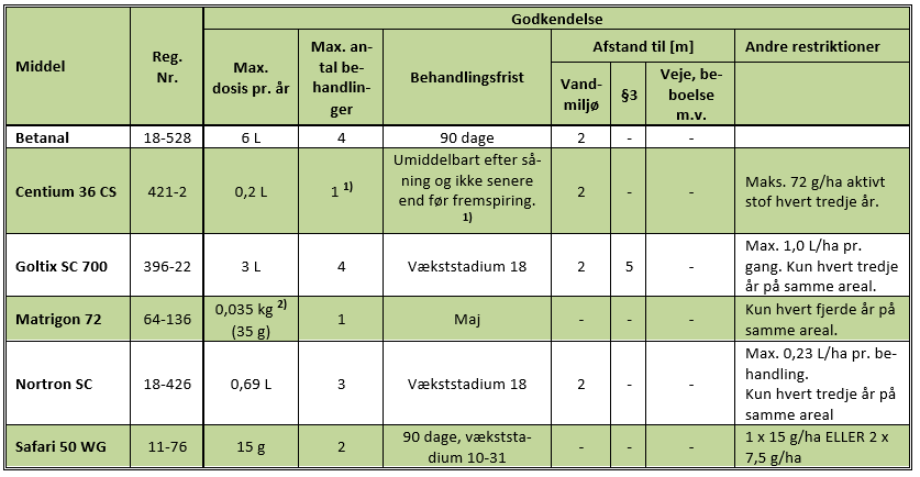 For de fleste af midlerne gælder der også andre og mere specifikke krav til anvendelse som f.eks. det maksimale antal behandlinger pr. sæson og den maksimalt tilladte dosering, som ofte er afhængig af afgrødens udviklingsstadium. Det vil føre for vidt at angive alle forhold i denne oversigt, og idet der også ofte er forskelle imellem godkendelserne på original- og kopiprodukter / sammenlignelige produkter, skal vi opfordre til, som reglerne også foreskriver, at du altid læser etiketten nøje inden anvendelse. Det er mere vigtigt end nogensinde, da der løbende bliver strammet op på godkendelserne, efterhånden som midlerne revurderes og får nye etiketter.