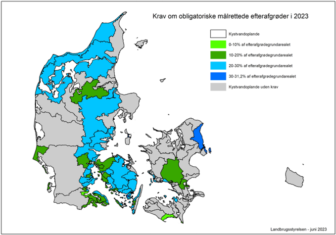 Figur 1 Kort over krav om obligatoriske målrettede efterafgrøder i 2023. (kilde: Landbrugsstyrelsen)