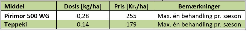 Er skadestærsklen overskredet, kan du behandle med Pirimor 500 WG eller Teppeki i fuld dosis.