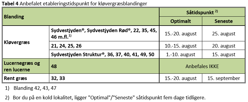 Da græsserne i kløvergræsblandingerne etablerer sig med forskellig hastighed, er det optimale såtidspunkt ikke det samme for alle kløvergræsblandinger. Generelt er etablering i perioden 10.-20. august passende for de fleste kløvergræsblandinger. I tabel 4 er vist en oversigt over det optimale etableringstidspunkt for en række almindeligt udbredte kløvergræsblandinger. Bor du på en kølig lokalitet i den centrale del af Jylland eller allerlængst mod nord, bør du nok planlægge etableringen efter, at den optimale periode – og seneste såtidspunkt – hos dig er fem dage tidligere.