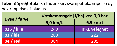 Da roerne har en kraftig bladmasse, bør du anvende en forholdsvis stor væskemængde. Anvend mindst 200-250 L/ha vand. Skulle det blive varmt, bør du sprøjte om morgenen på saftspændte planter. Undgå at køre for hurtigt, da det giver en dårligere nedtrængning i den bladrige afgrøde og dermed en dårligere dækning; se forslag til sprøjteteknik i tabel 3 nedenfor.