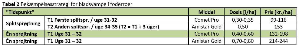 I forsøg i sukkerroer har Comet Pro haft den bedste effekt, hvorfor dette middel foretrækkes til den første behandling. For at begrænse risikoen for resistensudvikling hos svampene, anbefales det dog kun at anvende Comet Pro én gang pr. vækstsæson, hvorfor Amistar Gold/Greteg Star bør anvendes i T2 ved splitbehandling. Forslag til bekæmpelsesstrategi ses i tabel 2 nedenfor.
