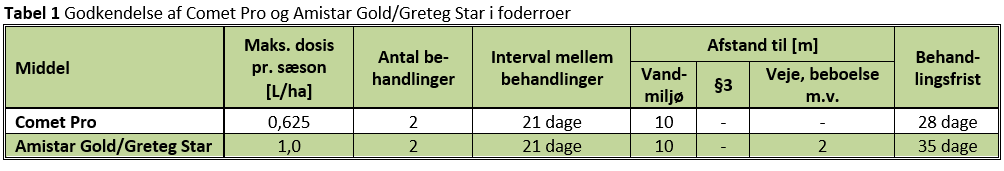 Propulse SE 250 har kun dispensation til anvendelse i sukkerroer, hvorfor det kun er svampemidlerne Comet Pro og Amistar Gold/Greteg Star, der må anvendes i foderroer. Godkendelse og behandlingsfrist for Comet Pro og Amistar Gold/Greteg Star ses i tabel 1.