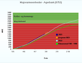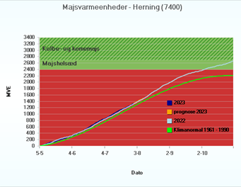 Figur 1 Majsvarmeenheder (MVE) for majs i Agerbæk og Herning, sået 20. april henholdsvis 5. maj (Kilde: SEGES)