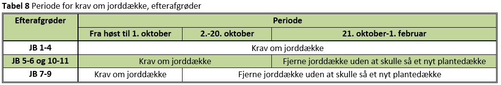 Indtil denne høst har "ikke-græsefterafgrøder" gerne måttet destrueres/pløjes efter den 20. oktober. Dette er ændret for sandjord, JB 1-4, således, at hvis der udføres en pløjning, eller hvis efterafgrøden erstattes af sort/bar jord, skal der nu etableres et plantedække senest fire uger efter jordbehandling.