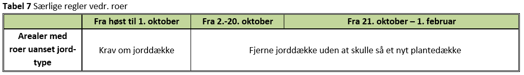For roer er det dog særligt gældende, at høstes roerne tidligst den 2. oktober, er der ingen krav om jorddække, mens der ved tidligere høst skal være jorddække. Høstes roerne inden 2. oktober, må jorden ikke jordbearbejdes før efter den 2. oktober pga. reglerne om jorddække, selvom reglerne for dyrkningsrelaterede tiltag har roer som en undtagelse. Der må gerne etableres vintersæd eller andet plantedække efter roer uanset høstdato.