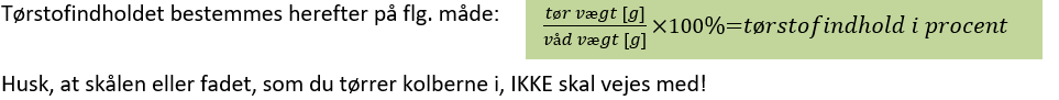 Ved at tørre et antal repræsentativt udvalgte majskolber, uden svøbblade og med tæt afskåret kolbestilk, ved 80 – max. 85 °C i en almindelig ovn, kan du selv bestemme tørstofindholdet. Kolberne skal tørres indtil vægten ikke længere daler; du skal forvente, at det tager omkring et døgn eller mere.