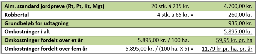 I tabel 2 er omkostningerne i forbindelse med udtagning af jordprøver opgjort for en ejendom på 100 ha.
