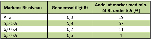 Tabel 3 Markens Rt-niveau, gennemsnitligt Rt og andel af marker med mindst