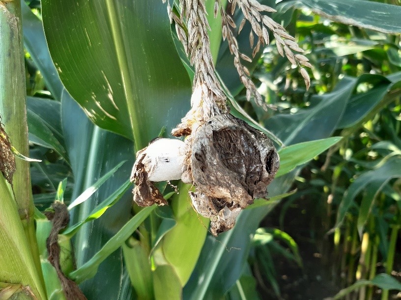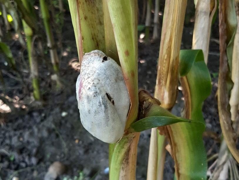 Der ses i år usædvanlig mange og udbredte angreb af svampesygdommen majsbrand. Smitten er sket som en primærsmitte tidligere på vækstsæsonen tilbage i juni måned, mens det var varmt; de optimale temperaturforhold for smittespredning er 26-34 °C. Sygdommens inkubationstid kendes ikke.