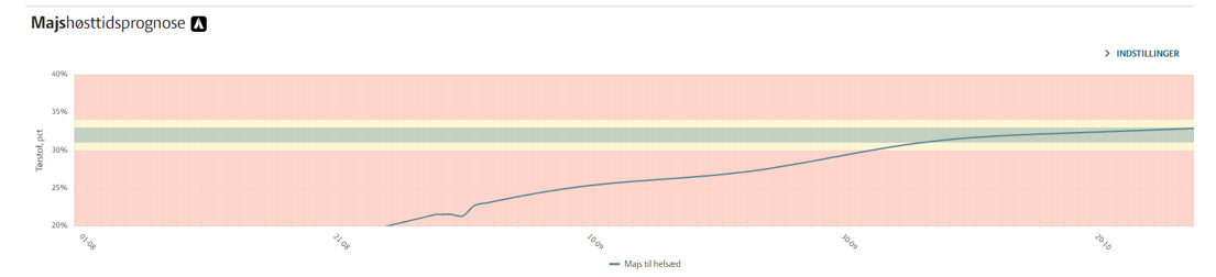 Som også blev omtalt i den seneste udgave af TILVÆKST Grovfoder er det muligt i CropManager at lave en majshøsttidsprognose. Hvis der ikke indtastes en tørstofprøve ud fra en prøveudtagning, anvendes der en standardmodel for afgrødeudviklingen baseret på vejret siden såning og langtidsprognosen for de kommende fem dages vejr for, hvornår den udvalgte sort, når det optimale tørstofindhold. Prognosen håndterer kun sorter, som har deltaget i Landsforsøgene i mindst to år.