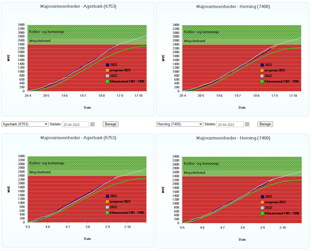 Figur 1 Majsvarmeenheder (MVE) for majs i Agerbæk og Herning, sået 20. april henholdsvis 5. maj (Kilde: SEGES)