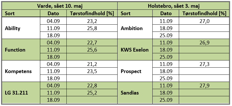 SEGES udtager tørstofprøver i majssortsforsøgene, og i SAGRO´s geografiske område er de placeret ved Varde og Holstebro. I forsøget ved Holstebro, som er en kølig lokalitet, er de første prøver først blevet udtaget mandag den 11. september, mens de i forsøget ved Varde, som er en lun lokalitet, allerede blev udtaget mandag den 4. september. Nedenfor ser du resultatet af årets hidtidige prøveudtagninger i sortsforsøgene. Prøverne er udtaget i de sorter, der indgår i måleblandingen på den respektive lokalitet.