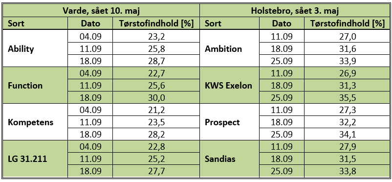 I tabellen nedenfor ses tørstofudviklingen i de to sortsforsøg ved Varde hhv. Holstebro. Bemærk, at der er forskel i hvilke sorter, der er udtaget prøver i, og at der også er forskel i, hvornår prøvetagningen er startet og sluttet. Ved forsøget i Holstebro er prøveudtagningen foretaget i sorter, som er lidt tidligere end sorterne i forsøget i Varde. Derudover er forsøget i Varde sået en uge senere end forsøget i Holstebro.