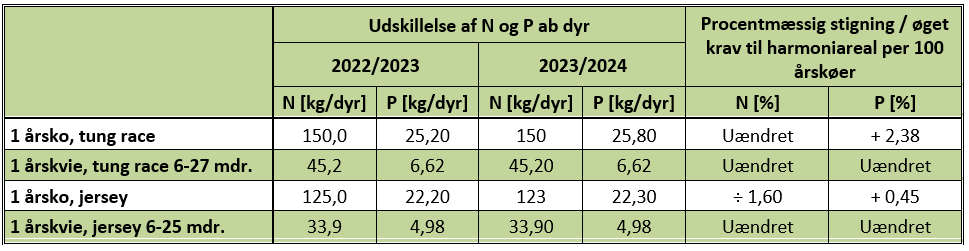 Med de opdaterede husdyrgødningsnormer for 2024 belastes harmoniberegningen med ekstra 0,6 kg fosforudskillelse pr. ko af stor race hhv. 0,1 for jersey.