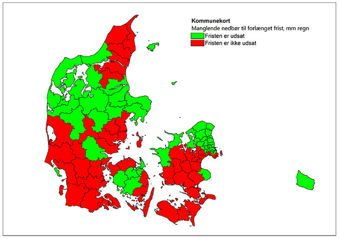 For at udløse en forlængelse af fristen for udbringning af flydende husdyrgødning skal der i ugerne 21-38 (ca. juni til sidst i september) falde mere nedbør end normalt, og samtidig skal der i ugerne 30-38 (ca. august til sidst i september) falde 30 procent mere nedbør end normalt.