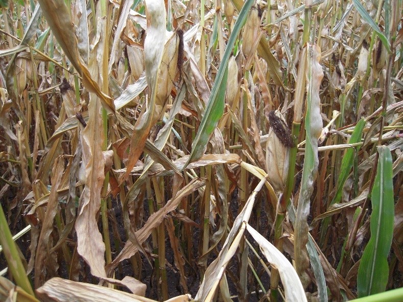 I en angrebet afgrøde vil der ikke ske yderligere produktion, og den skal opfattes som en vissen afgrøde, med angreb af fusarium. Afgrøden skal høstes hurtigst muligt, da svampen angriber plantevævet og forårsager væltning/lejesæd og nedknækkede kolber.