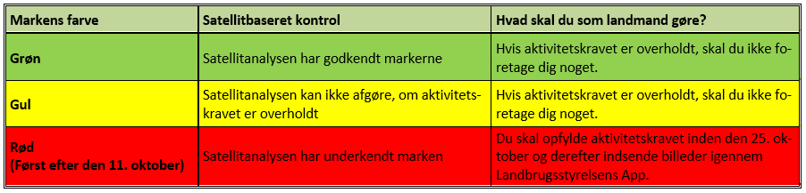 Landbrugsstyrelsens satellitkontrol er efterhånden ved at være kendt af de fleste. Satellitkontrollen startede for et par år siden med at kontrollere, om aktivitetskravet var overholdt på græsarealer. I år er kontrollen udvidet og omfatter også kontrol af korrekt anmeldelse af afgrøder, og om pløjeforbuddet på diverse bioordninger er overholdt. I denne omgang omfatter det satellitkontrollen af, hvorvidt aktivitetskravet er overholdt. Som udgangspunkt er det næsten udelukkende græsarealer som bliver underkendt i denne kontrol. Den satellitbaserede kontrol af aktivitetskravet går også under navnet "trafiklys", og det skyldes, at markerne får en farve afhængig af Landbrugsstyrelsens bedømmelse af markerne ud fra satellitanalyse. I nedenstående tabel kan du se, hvad de respektive farver betyder i forhold til opfyldelse af aktivitetskravet.