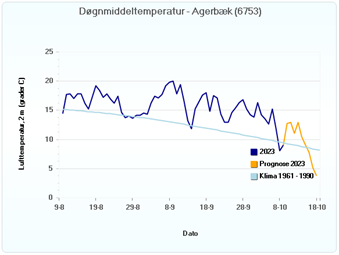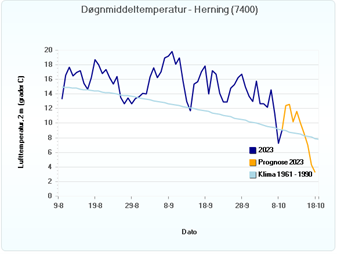 På landbrugsinfo er det muligt at følge og få en prognose for døgnmiddeltemperaturen. I nedenstående tabel er døgnmiddeltemperaturen vist for Agerbæk og Herning.