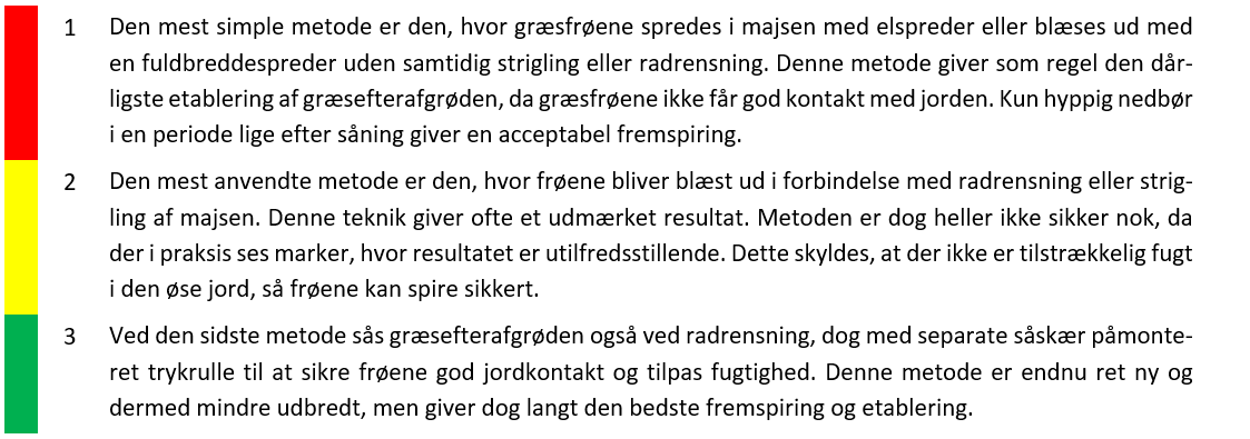 Lidt forenklet er der tre måder, hvorpå græsefterafgrøden bliver etableret. Metodens egnethed er vist med farverne rød, gul og grøn.