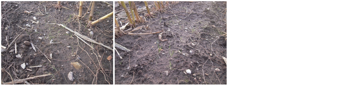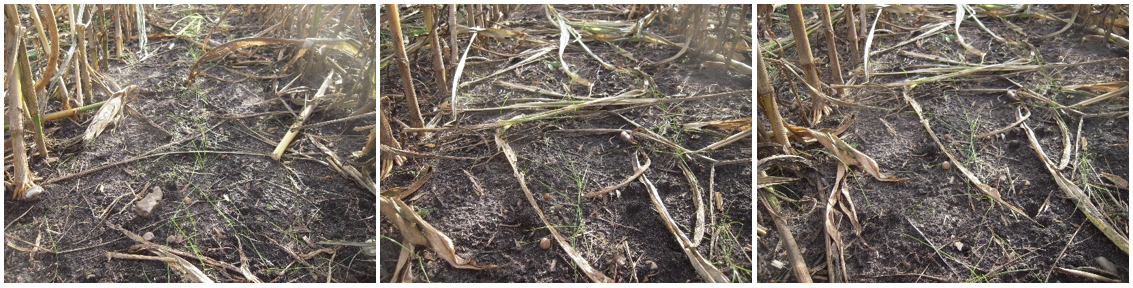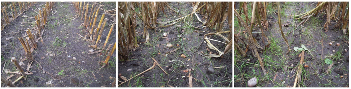 Billede 3-5 Efterafgrøde, fotograferet 23. oktober; billede 3: 12-14 dage efter majshøst, billede 4 og 5: Majsen er endnu ikke høstet. Sildig rajgræs, fodertype, plus italiensk rajgræs. Sået i forbindelse med radrensning. Græsfrøene er blæst ud mellem rensetænderne. Efterafgrøden vil blive godkendt ved kontrol. (Foto: Thomas Harbo, SAGRO)