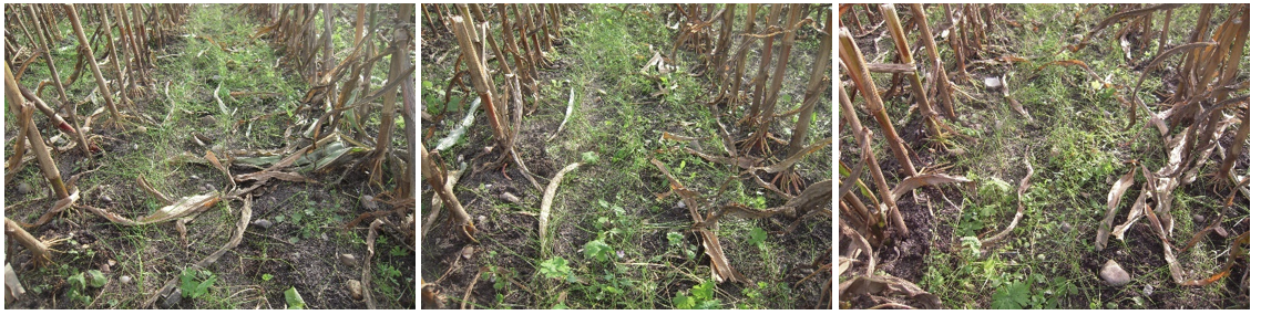 Billede 9-11 Efterafgrøde, fotograferet 12. oktober, få dage efter majshøst. Sildig rajgræs, fodertype, sået med samme maskine som er anvendt på billederne 6-8. Majssorten er her Skipper. Græsplanterne findes, men de er meget spinkle. Aktuelt er det tvivlsomt, om efterafgrøden vil kunne godkendes ved kontrol, men i løbet af de kommende måneder vil den kunne vokse til. Får vi den efterhånden normale grønne danske vinter, vil der givetvis allerede være et kraftigt græsdække i det tidlige forår. (Foto: Thomas Harbo, SAGRO)