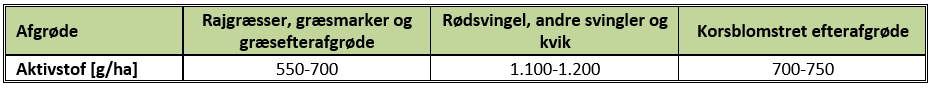 Der skal ikke så stor dosis til nedvisning af græsefterafgrøderne, mens der ved behandling af korsblomstrede efterafgrøder og kvik må noget mere til.