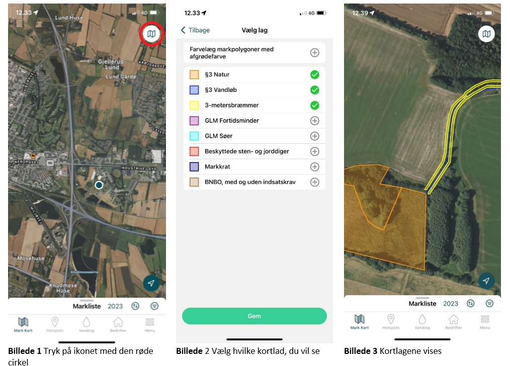 På billede ét trykkes på ikonet med den røde cirkel, og du vil få vist billede nummer to. Her vinkes de lag af, du gerne vil have vist, og der afsluttes med gem. Nu vil du få vist de kortlag, der er vinket af som eksemplet viser i billede 3.