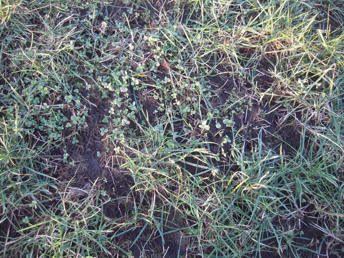 Billede 2 Plantedækket i en ældre slætgræsmark er ved at være for ring med mange mindre områder uden græs. Hvidkløveren er ved at vokse ind i de åbne pletter. (Foto: Thomas Harbo, SAGRO)