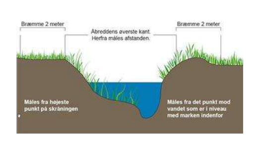 Det kan medføre voldsomme sanktioner at overtræde dyrkningsbegrænsningerne i 3 meter bræmmerne. Vi har eksempler på, at selv små førstegangsovertrædelser medfører 1-3 procent træk i EU-støtten samt politianmeldelse eller et administrativt bødeforlæg. I gentagelsestilfælde kan sanktionen løbe op i 15 procent af EU-støtten, så du må på ingen måde tage let på, hvorvidt kravet overholdes. Bemærk, at den dyrkningsfrie bræmme skal være 3 meter bred, når du ansøger om grundbetaling, selvom der står 'Bræmme 2 meter' på nedenstående figur, som er hentet i Landbrugsstyrelsens nyeste instruks for konditionalitet 2023. I Landbrugsstyrelsens instruks giver flg. anvisning på, hvordan 3 meterbræmmen opmåles: "Bræmmen på 2 (3 red.) meter langs vandløb og søer beregnes fra vandløbets eller søen øverste kant (se figur herunder). Den øverste kant er overgangen fra det skrånende terræn mod vandløbet eller søen til det flade terræn, der normalt kan jordbehandles. "Den øverste kant" af visse søer er overgangen mellem bevoksningen af vand- og sumpplanter og egentlig landplanter."