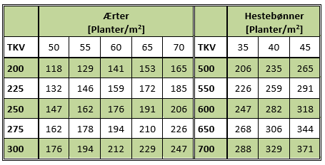 Tabel 2 Vejledende udsædsmængde i kg/ha for ærter og hestebønner