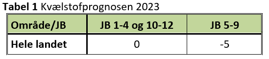 Årets kvælstofprognosen lander på 0, dvs. ingen ændring, for størstedelen af jordtyperne, mens kvælstofbehovet for jordtyperne JB 5-6 og 7-9 reduceres med 5 kg kvælstof pr. ha.