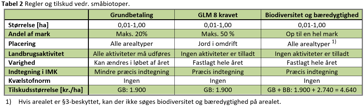 Som noget nyt er der i CAP 23-reformen mulighed for etablering småbiotoper. Småbiotopen kan have flere forskellige funktioner og må både stå helt uberørt, men også aktivt tilplantes eller tilsås. Til småbiotopen knyttes forskellige muligheder og krav afhængigt af, hvilken ordning den anvendes til opfyldelse af. I tabel 2 er kravene opstilles set i forhold til den enkelte ordning, som småbiotopen kan indgå til opfyldelse af.