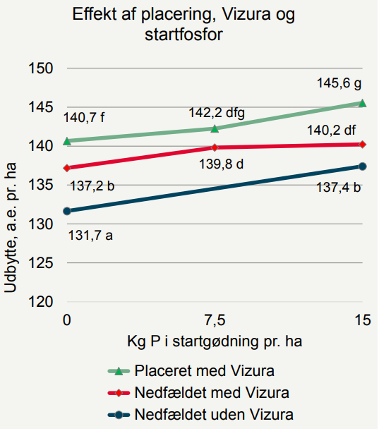 For de fleste kvægbrug er det i indeværende gødningsår svært at finde plads til NP-startgødning med handelsgødnings-fosfor, medmindre der er afsat store mængder gylle. I nedenstående figur ses resultaterne af 14 forsøg, som er kørt over en treårig periode. Forsøgene er gennemført med såvel kvæggylle og afgasset gylle. Der ses ikke signifikante udbytteforskelle mellem kvæggylle og afgasset gylle.