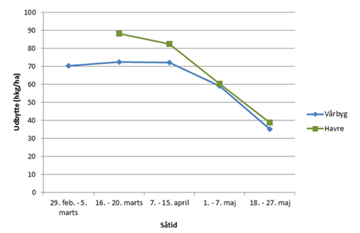 Figur 2 Udbytte i vårbyg og havre afhængig af såtidspunkt. De viste data stammer fra 10