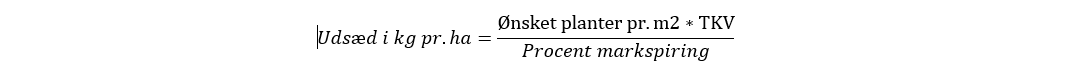 Ovenstående tabel er vejledende og gælder under optimale forhold på den valgte sådato. Ved dårligere forhold og senere sådato skal udsædsmængden øges. Beregningen baserer sig på den kendte formel for udregning af udsædsmængde, som også ses nedenfor.