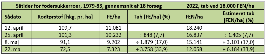 Tilbage i perioden 1979 – 83 blev der gennemført 18 forsøg med såtidspunkter for fodersukkerroer. Resultaterne er vist i tabellen her under med tab opgjort i FE/ha og procent ved at udsætte sådatoen i forhold til den 12. april, som dengang var udgangspunktet, de øvrige etableringstidspunkter blev sammenlignet med. I tabellens højre del har jeg estimeret udbyttetabet ved samme procentvise reduktion i udbyttet ved et aktuelt udbytteniveau i 2022/2023, som er gennemsnittet i årets sortsforsøg med foderroer, på 18.242 FEN/ha.