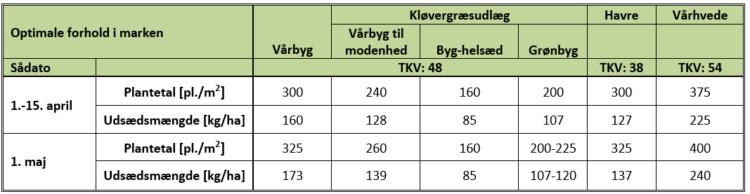 Tabel 1 Vejledende udsædsmængde ved etablering af vårsæd med og uden kløvergræsudlæg under de angivne forhold.