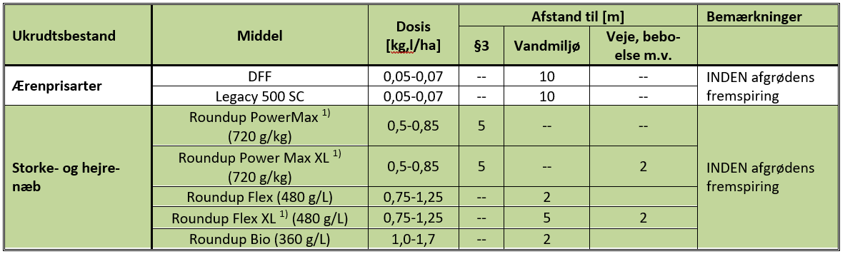 Tabel 1 Løsninger til ukrudtsbekæmpelse i majs inden afgrødens fremspiring