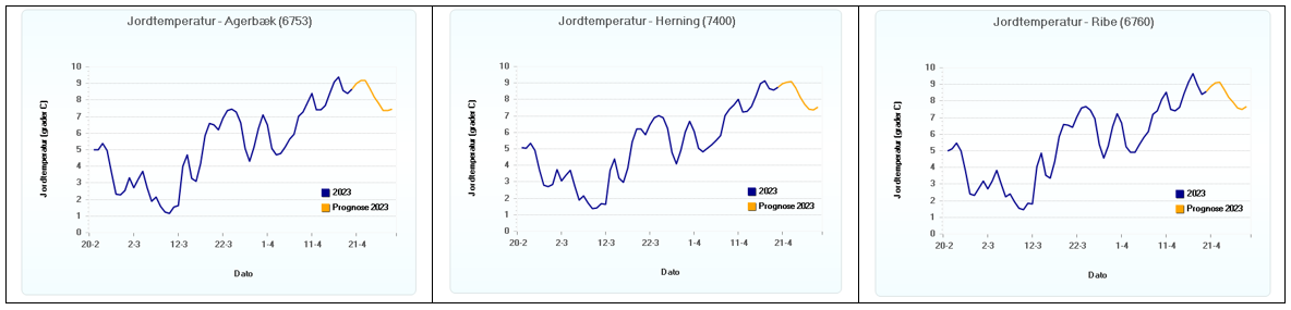 Figur 1 Jordtemperatur. Aktuel temperatur den 21. april, og femdøgnsprognose for Agerbæk, Herning og Ribe (Kilde: SEGES)